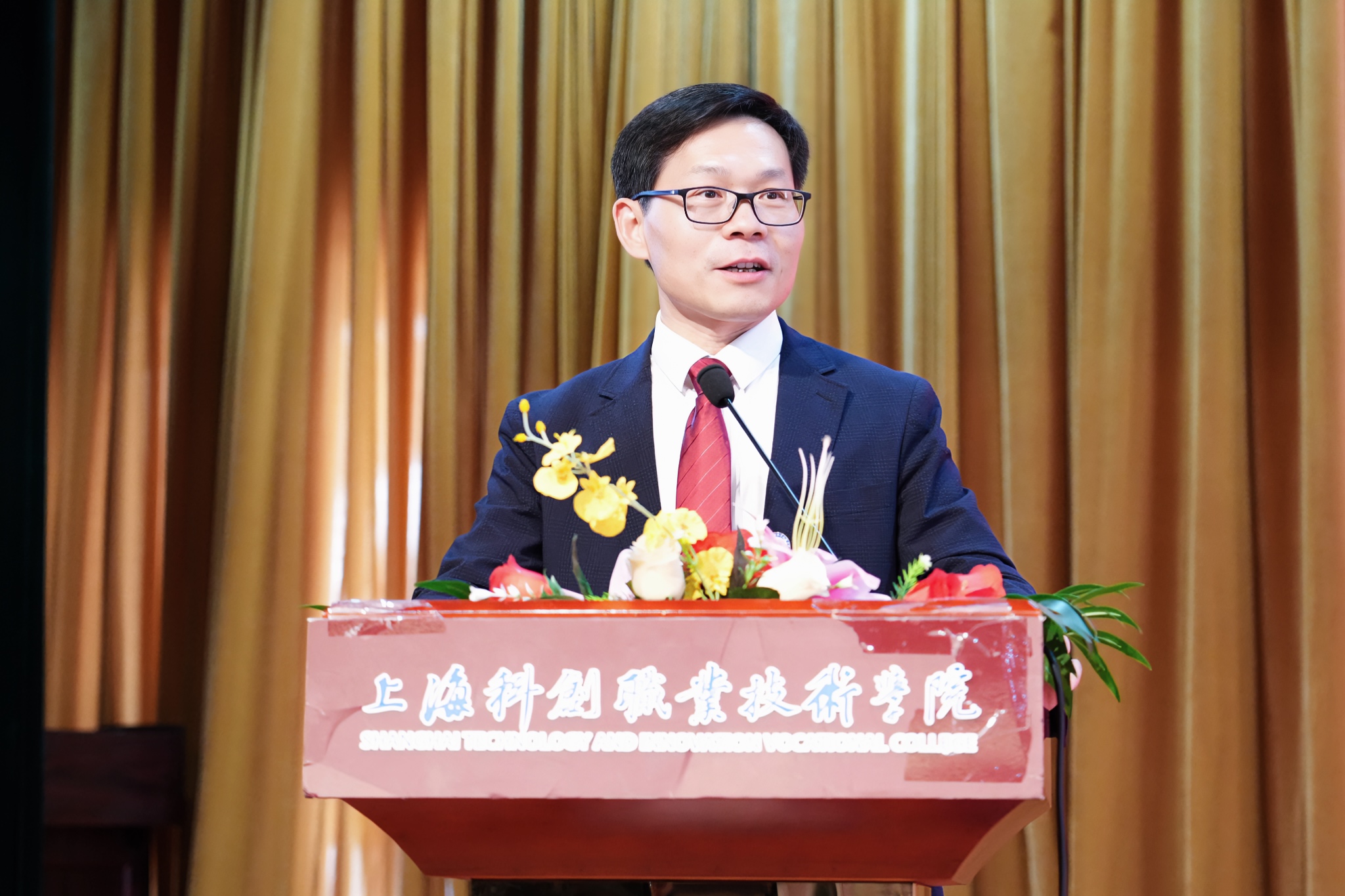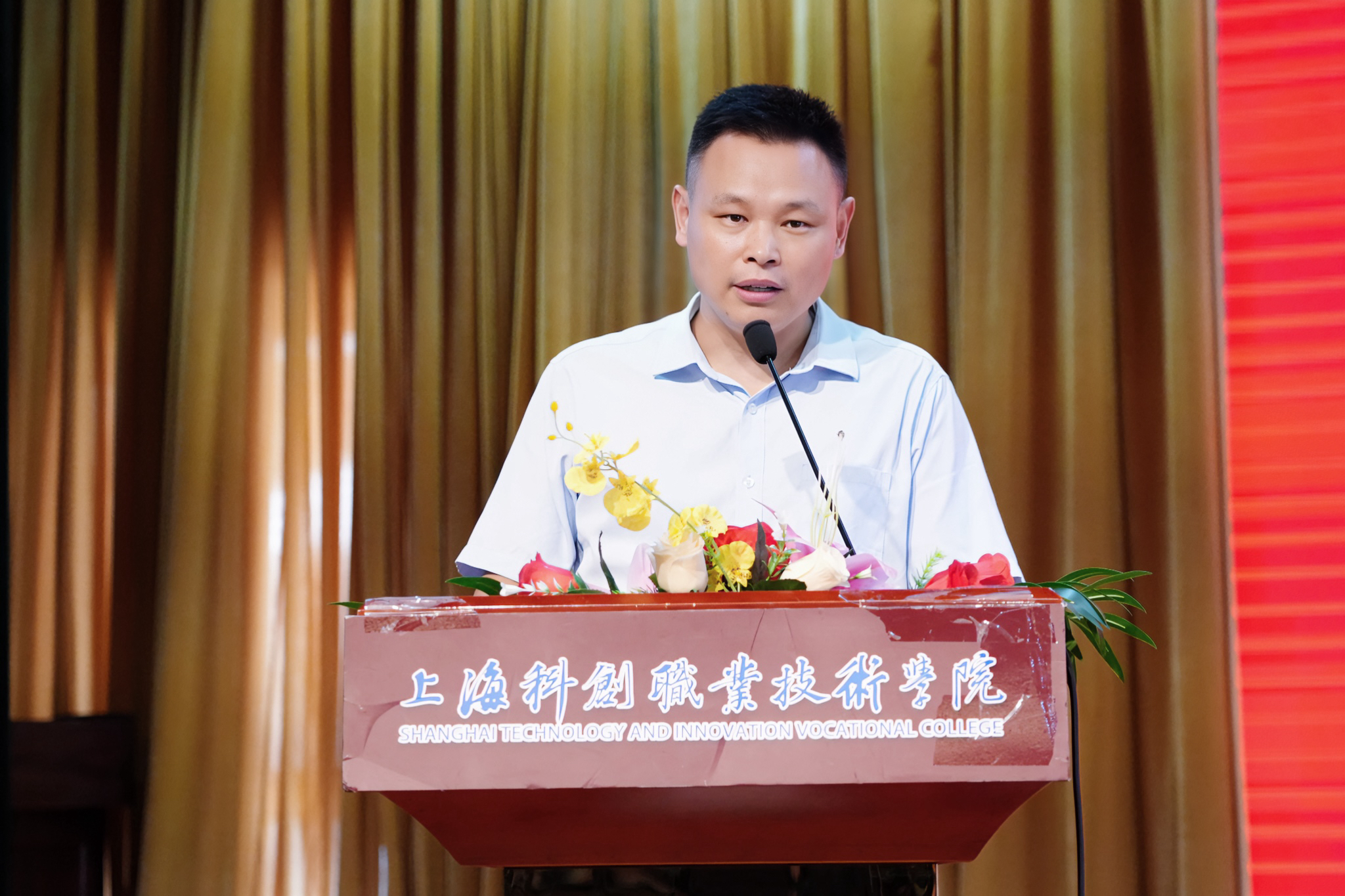 典礼在庄严的国歌声中开始,全体师生肃立,共同见证了这一神圣而庄严的时刻。李闽洲以“有技者事竟成”为主题,对新同学们寄予了殷切期望和美好祝愿。在讲话中回顾了过去一年里科创学子在国内外各项技能大赛中取得的优异成绩,这些荣誉不仅彰显了科创职院的教学实力,更为新同学们树立了学习的榜样。鼓励新同学们要树立坚定的信念和伟大的理想,保持“初生牛犊不怕虎”的锐气,以永不懈怠的精神状态和勇往直前的奋斗姿态,投身到未来的学习和生活中。他强调,作为科创人,要践行“有技者事竟成”的口号,努力从以德立身,做一个品德高尚的人;知行合一,做一个勇于实践的人;坚持不懈,做一个不轻言放弃的人等三方面全面提升,奋力进取。李闽洲寄语新同学们:“Where there is a skill, there is a way。”他希望同学们在今后的学习和生活中保持好奇心、鼓足勇气、精诚合作、毫不畏惧困难挑战,最终成为不负时代、不负梦想、不负青春的科创人。