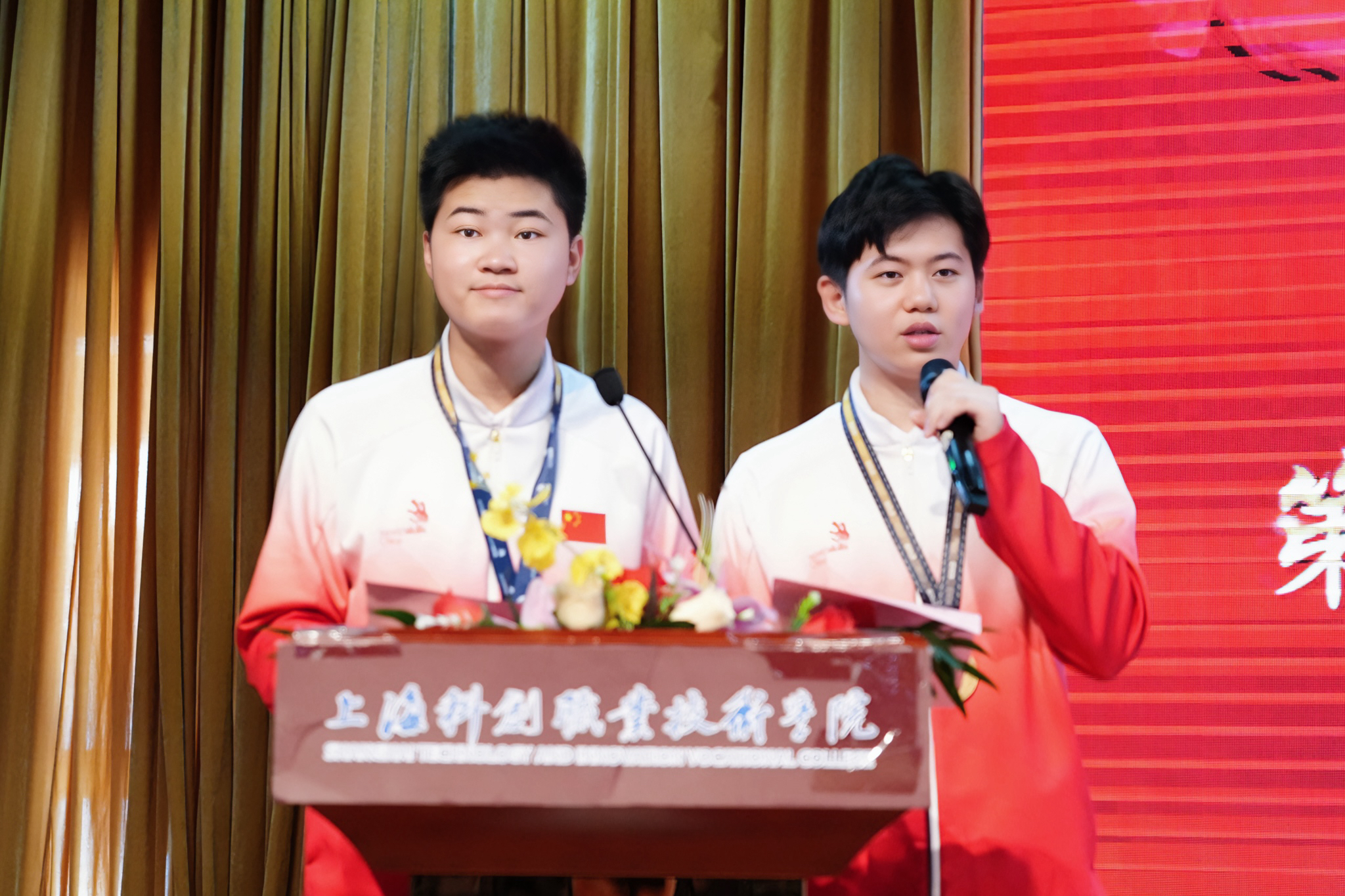 值得一提的是,学院教师卢俊威、谢辉铉,作为第47届世界技能大赛的参赛选手,在激烈的国际竞争中脱颖而出,成功夺得工业4.0项目的世界冠军!并一举夺得全场唯一的“阿尔伯特﹒维达大奖”!这一消息如同春风拂面,让在场的每一个人都为之振奋。为了庆祝这一历史性时刻,特别邀请了世赛选手卢俊威、谢辉铉上台发言,分享了他们在备赛过程中的艰辛与坚持,以及在赛场上的拼搏与荣耀,深深感染了每一位在场的师生。