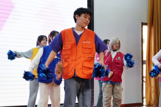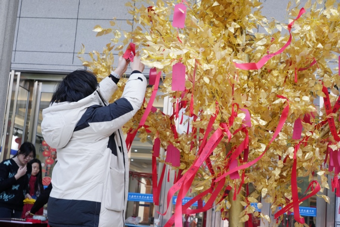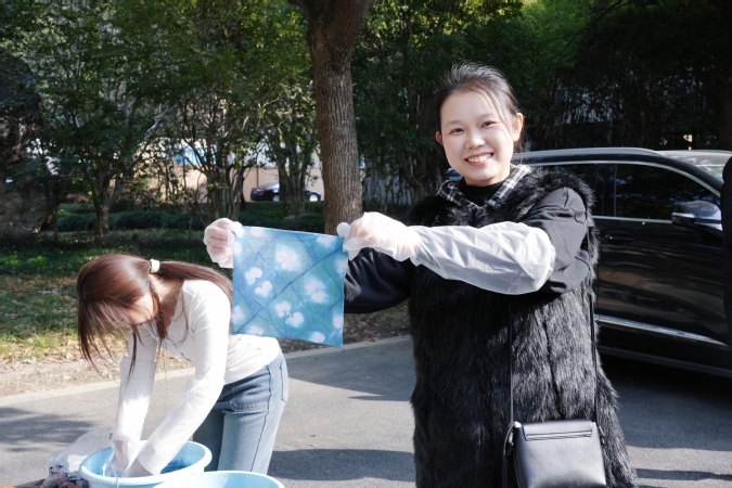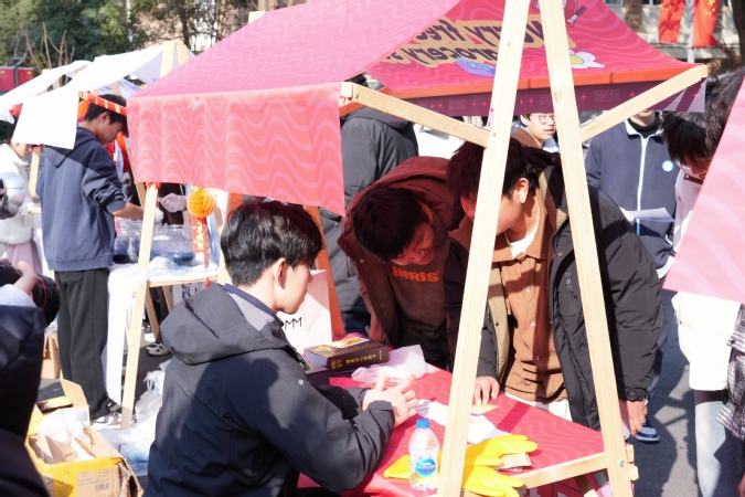 为了丰富同学们的校园生活,本次活动特意在场外布置了互动环节。外场精美喜庆的布置与激昂的乐队表演相得益彰,特色摊位更是吸引了众多师生的目光。扎染摊位尤为引人注目,师生们亲手参与手帕、小包、T恤等物品的扎染制作,创意与想象在色彩斑斓的染料中绽放,尽显传统文化的独特韵味。隔壁的“解忧杂货铺”也别出心裁,心理老师坐镇其中,在轻松愉快的氛围中,帮助师生们解决了学习生活的困惑。