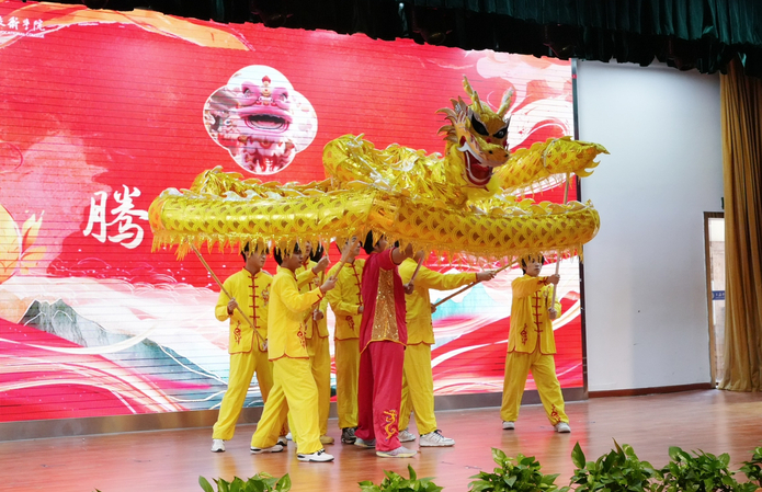 校舞龙社团带来表演《腾飞中国龙》,凭借同学们的精湛技艺,赢得阵阵掌声。