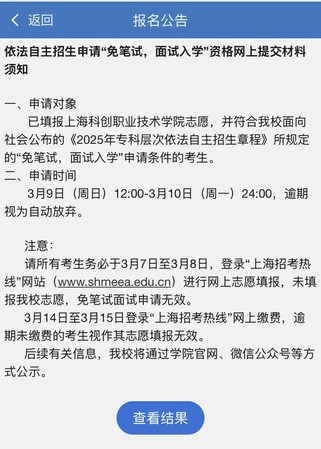 登录后,出现“免笔试,面试入学”资格网上提交材料须知,点击下方“查看结果”按钮,如下图所示: