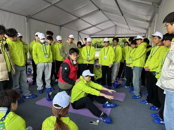 志愿者们认真地进行拉伸培训