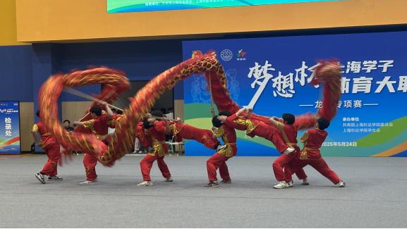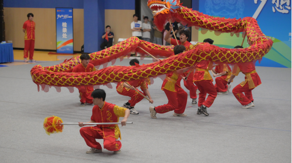 比赛现场,来自上海各高校的舞龙队伍齐聚一堂,各占绝技。现场观众的加油声、欢呼声此起彼伏,共同沉浸在这场传统体育的狂欢之中。科创舞龙社团的队员们身穿红色队服,手舞红色长龙,矫健的身姿、流畅的动作将龙的威严与灵动展现得淋漓尽致,赢得现场观众阵阵欢呼与掌声。