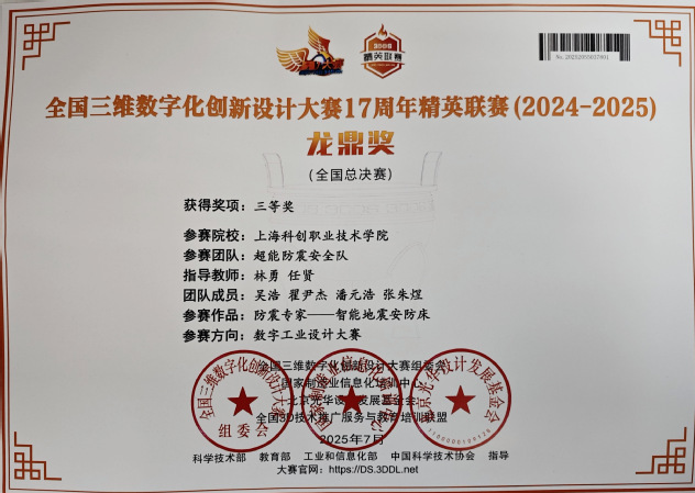 在全国三维数字化创新设计大赛17周年精英联赛(2024-2025)总决赛中,在林勇、任贤等专业教师指导下,智能汽车学院吴浩、翟尹杰、潘元浩、张朱煜四位同学组成的团队,凭借作品《防震专家——智能地震安防床》成功晋级全国总决赛,并最终荣获全国三等奖。
