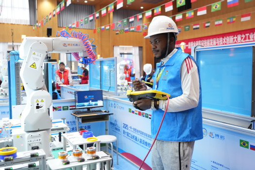 本届赛事规模实现跨越式增长,据赛项专家组长、天津职业技术师范大学机器人及智能装备研究院院长邓三鹏教授介绍,参赛人数较去年的79人翻番,国际组亮点尤为突出:30名国际选手涵盖在华留学生与海外专程赴赛者,其中泰国格乐大学学生远道而来参赛,多元背景的选手汇聚一堂,不仅提升了赛事国际影响力,更搭建起金砖国家及“一带一路”沿线国家工业机器人技术人才互鉴的桥梁。