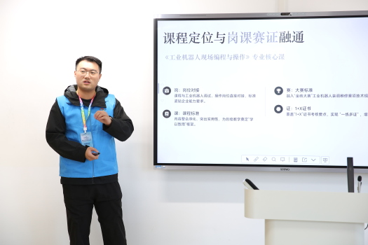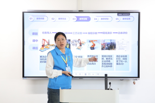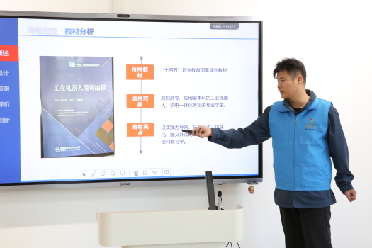 此外,10分钟答辩环节更显职工特色:选手借助PPT与视频,教师从工业机器人课程教学目标定位、学习情境设计,到教学方法选择与评价体系构建展开展示,不少人将竞赛技术要点融入教学案例,诠释“懂技术、善教学”的双能特质,体现“以赛促教”理念,企业职工展示工业机器人在工业现场应用的实际案例,以及使用过程的故障排查,运行维护的技巧。