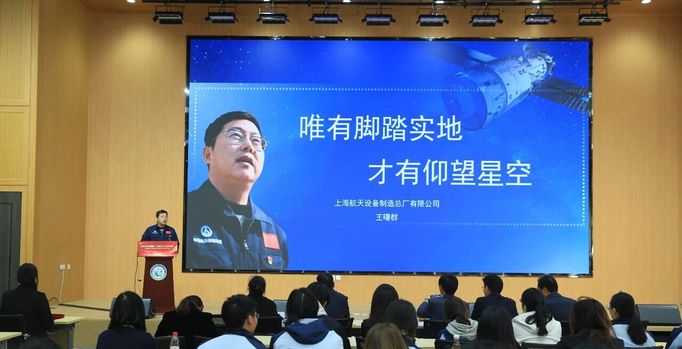 在主题宣讲环节,王曙群同志以《唯有脚踏实地,才有仰望星空》为主题,用朴实真挚的语言,讲述了自己三十余年扎根航天装配一线的奋斗故事。他结合空间交会对接等重大航天工程总装任务的亲身经历,系统展现了中国航天从跟跑、并跑向关键领域领跑的跨越式发展历程。他所体现的执着专注、精益求精、勇攀高峰、甘于寂寞的精神,深深感染了在场师生,现场多次响起热烈掌声。