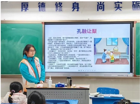 这一次,不仅仅是一次志愿服务,更是一场生动的社会实践课。青马工程班的学员们,充分发挥思想引领作用。他们将理论学习成果转化为孩子们听得懂、喜欢听的小故事。用红色故事描绘上海作为初心始发地的红色资源,讲述英雄模范的感人事迹;开设“礼仪小课堂”,引导孩子们从小学会尊重、友爱与互助;围绕“匠心传承”的主题,讲述学校的冠军故事,把抽象的“大道理”化为孩子们可感可知的生动一课。