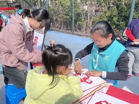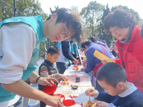 “扭扭棒·柿柿如意”摊位前人气高涨、排起长队,机器人2532班李诗敏与互联网2451班何丁杰耐心细致,手把手教孩子们制作扭扭棒小柿子,在指尖互动中传递“柿柿如意”的美好元宵寓意。福字拓印志愿者、机器人2431班顾俊颢提前一小时到岗,主动协助工作人员布置工具、调试墨辊,全力保障体验活动顺利开展。“能用自己的服务让社区居民感受传统年味,特别有意义。”顾俊颢说道。
