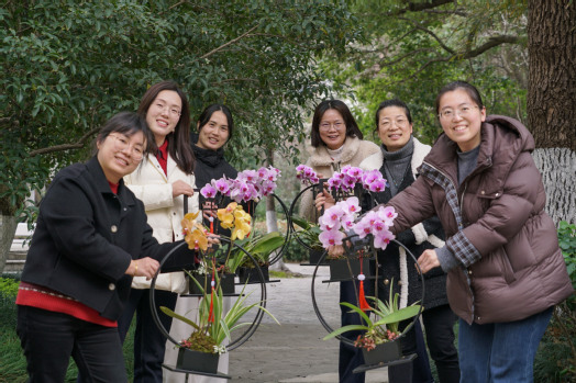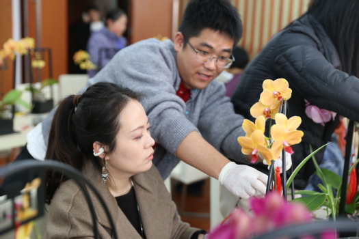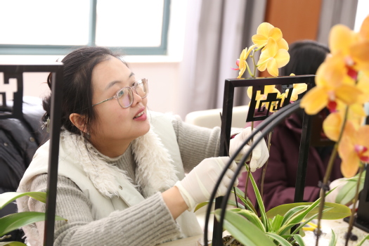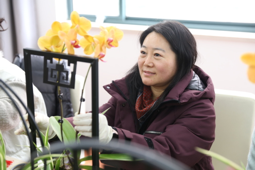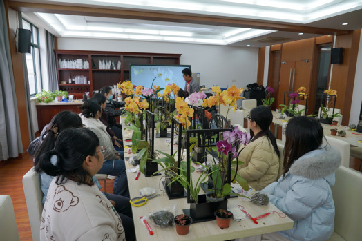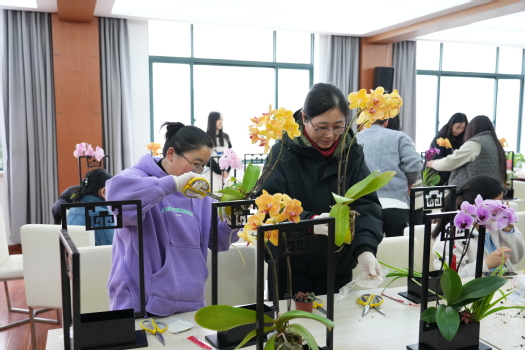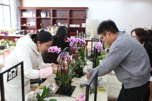 本次活动以中式置景艺术为载体,特邀专业花艺师现场授课指导。活动伊始,花艺师从中式插花的历史渊源、文化内涵娓娓道来,细致讲解了兰草的养护知识与中式置景的搭配技巧,通过现场演示布景设计、栽种、定型等关键步骤,让大家直观感受中式美学的意境之美。蝴蝶兰清雅的花姿,搭配精致的置景器具,让现场的女教职工们沉浸在传统花艺的魅力之中。