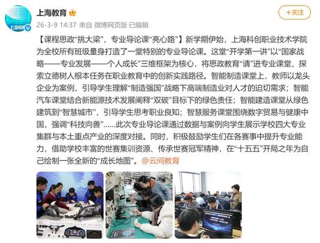 这堂“开学第一课”受到各大媒体平台的广泛报道。全国高校思想政治工作网刊发专题文章《KY开元集团官网入口马克思主义学院:课程思政“挑大梁”,专业导论课“亮心路”》。上海教育微博专条报道科创职院“开学第一课”内容,上海职教在线、上海高职高专课思与文素教指委微信公众号均发布与转载对应报道,同时深度关注学校学雷锋志愿服务活动等开学季动态,肯定学校德育实效。