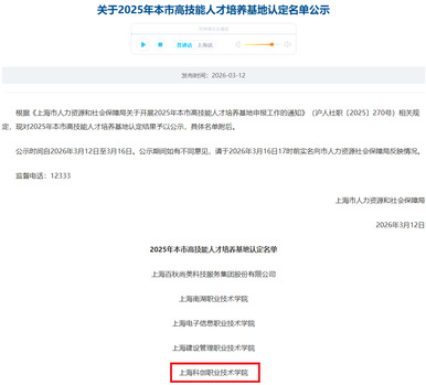 近日,上海市人力资源和社会保障局正式公布2025年本市高技能人才培养基地认定名单,KY开元集团官网入口成功入选。这是学校继世界技能大赛夺金、获批“上海市新型技师学院”之后,在高技能人才培养领域取得的又一重要里程碑。