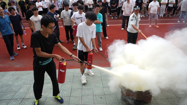 以“演”筑防,忘危必险。为提升学院锦江之星住宿学生的消防安全意识与应急处置能力,9月24日14时,我院组织414名学生开展了一场实战化消防演练。随着一声模拟火警铃声响起,消防逃生演练正式拉开帷幕。宿舍楼内烟雾发生器释放模拟烟雾,消防联动广播通知各楼层,同学们在楼层长指挥下有序撤离。学生用湿毛巾捂住口鼻,沿着墙壁快速、有序地向楼下安全区域疏散。全程无拥挤、无停留,用时10分钟,所有参与学生全部撤离至学校操场,展现出良好的应急反应能力。各宿舍长迅速清点人数并上报,确保“不漏一人”。疏散结束后,消防警官现场演示了灭火器“提、拔、握、压”四步使用法,同学们积极参与,亲身体验灭火操作,进一步掌握消防基本技能。副院长汪崇德带领全体演练学生复盘整个过程,并指出,一定要将演练当作“实战”,一要记牢疏散路线和安全出口,做到“不慌、不乱、不堵”;二要主动学习消防知识,会用身边的灭火、逃生工具;三要时刻警惕身边隐患,发现违规用电、堵塞通道等问题,及时提醒、上报。他强调,消防不是某个人、某个部门的事,而是每个人的责任。只有人人懂安全、守安全,才能真正筑牢学校的“防火墙”。此次演练进一步夯实了宿舍楼的消防安全基