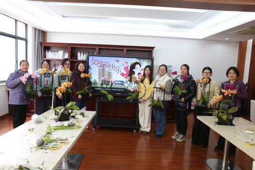 大屏幕上唯美的画面、振奋人心的宣传语、清新雅致的蝴蝶兰、笑意盈盈的女教师....... 春日的校园洋溢着节日的氛围。在第116个“三八”国际劳动妇女节来临之际,为深入贯彻松江区教育系统“巾帼心向党 实干建新功”的妇女节活动主题,切实提升女教职工的获得感、幸福感,学校工会精心策划了“一路向春 满袖芬芳”兰草中式置景DIY活动。3月6日下午,活动在学校11号楼教工之家二楼咖啡厅温馨启幕,全校女教工会员分四场参与,在指尖生花的美好体验中,共赴一场春日之约,共度专属巾帼的美好节日。本次活动以中式置景艺术为载体,特邀专业花艺师现场授课指导。活动伊始,花艺师从中式插花的历史渊源、文化内涵娓娓道来,细致讲解了兰草的养护知识与中式置景的搭配技巧,通过现场演示布景设计、栽种、定型等关键步骤,让大家直观感受中式美学的意境之美。蝴蝶兰清雅的花姿,搭配精致的置景器具,让现场的女教职工们沉浸在传统花艺的魅力之中。实操环节,女教职工们化身“花艺匠人”,在花艺师的耐心指导下,充分发挥巧思与创意,修枝、造型、布景、定型,每一个步骤都细致用心。平日里耕耘在讲台、奋战在教学管理一线的巾帼们,此刻放慢脚步,在一花一叶的搭配