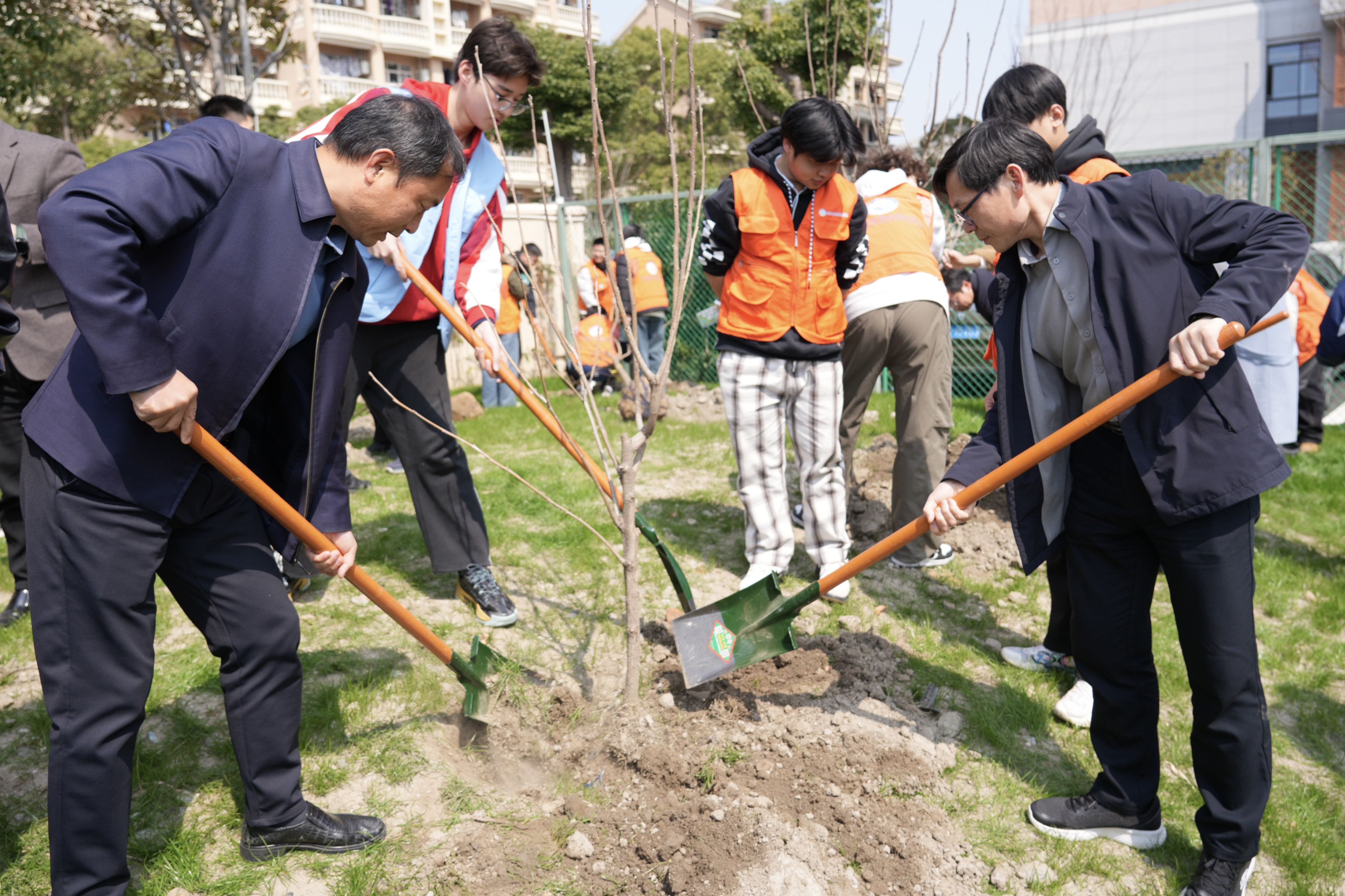 三月春光正好,第48个植树节如约而至。3月12日中午,学校组织开展“劳动砺心志,护绿我先行”主题植树活动,深入践行“绿水青山就是金山银山”的生态文明理念。校领导与师生代表齐聚校园一角,用双手为春天添一抹新绿,让青春在劳动中焕发光彩。正午时分,阳光洒满操场东北角的植树区域。师生们准时集结,各学院迅速清点人数、分发工具,整装待发。在后保处工作人员说明劳动安全注意事项后,大家有序进入各自责任区,挥锹铲土、扶苗填坑、提水浇灌,一派热火朝天的劳动景象徐徐展开。校领导与同学们并肩劳作,挖坑、扶苗、培土、浇水,“劳动光荣、绿色发展”的价值观念在谈笑间自然传递。现场分工明确、配合默契,工作人员穿梭其间巡回指导,确保每一棵树苗都栽得规范、种得安心。短短半小时,几十株树苗便在春风中稳稳立起。劳动结束后,同学们还在精心准备的挂牌上写下绿色寄语,并郑重签下自己的名字,将满载心意的挂牌悬挂在亲手栽下的树苗上——“与小树共成长”“愿绿色永驻校园”“守护这一抹青绿”……一句句朴素的愿望随之深深扎根于校园沃土之中。一次植树,不仅是一次劳动实践,更是一堂行走的生态文明课。同学们亲身参与植树护绿,在身体力行中养成热爱劳动