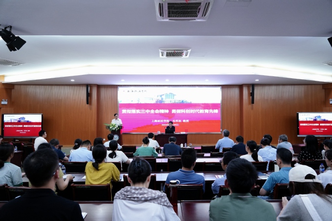 9月29日下午,学院特邀市教卫工作党委系统专家宣讲团成员、上海政法学院副校长毛军权教授开展学习贯彻党的二十届三中全会精神专题辅导报告。学院党委副书记、院长李闽洲,党委委员、常务副院长李志伟,副院长何佩军、项国平出席活动。活动由李闽洲主持。毛军权以《贯彻落实三中全会精神勇做科创时代教育先锋》为题,结合自己丰富的理论研究成果和工作实践经验,从三中全会的特殊意义和主要内容、构建支持全面创新体制机制与深化教育综合改革、聚焦使命鼓足干劲把全会精神落到实处三个方面,深入浅出地讲解了全会精神的丰富内涵和精神实质,主题鲜明、内容丰富,帮助与会人员厘清了全会精神内容的学习脉络和精髓要义,为进一步准确把握、深入理解、全面贯彻党的二十届三中全会精神提供了重要指导。李闽洲在主持报告时指出,此次专题讲座逻辑清晰、理实一体、视角独特、重点突出,对于学院广大干部党员深入领会党的二十届三中全会精神具有很强的思想性、理论性和针对性,是一堂精彩纷呈、引人入胜的专题讲座。李闽洲就后续学习贯彻党的二十届三中全会精神提出要求,各支部要认真组织全会精神学习,广泛发动全员学、丰富形式灵活学,坚持原原本本、突出联系实际学,切实领会精