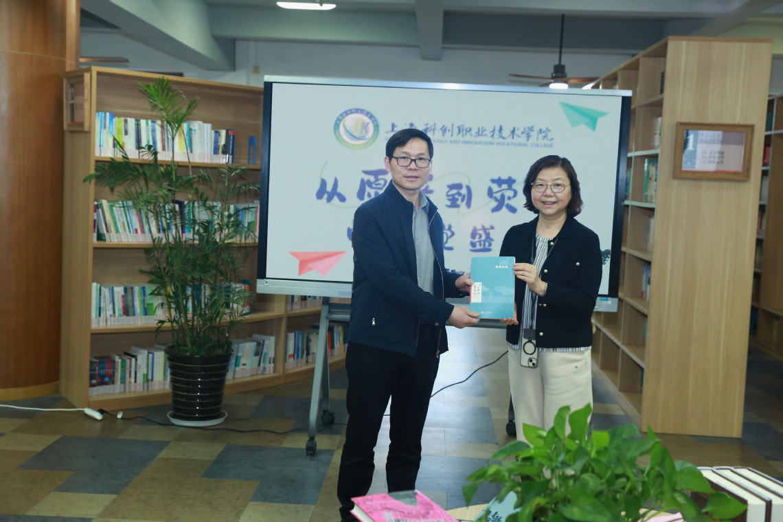 随后李闽洲院长赠送了名为《海派文化图鉴——锦绣云间》的书给郑老师,以表达感谢。李闽洲在讲话中指出:希望全校师生以书为友,以书润心,保持好奇心和求知欲,积极投入到阅读的海洋中。他希望师生们在读书前带着问题,读书时带入思考,读书后带出笔墨,通过全员乐读、善读、活读,共筑书香科创的阅读品牌。