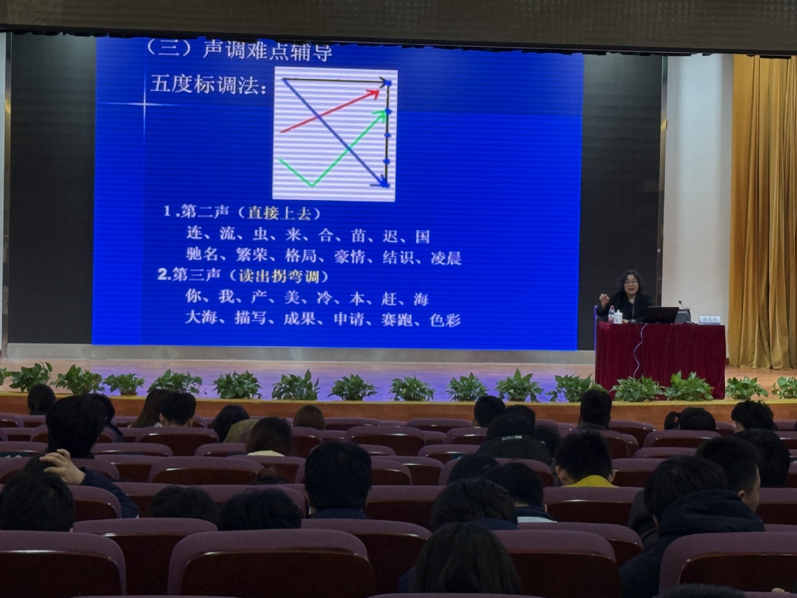 讲座中,余恩秀老师从国家语言文字工作的战略意义出发,系统解读了普通话水平测试的政策背景、评分标准及等级划分,并结合多年测试评分与复审经验,帮助师生准确把握测试要求。针对测试内容,余老师围绕单音节字词、多音节词语、短文朗读、命题说话四个板块,逐一分析考查重点与常见失分点,通过典型例题讲解发音规范、语调控制及语言组织技巧,为学生提供可操作的备考指导。此外,余老师还详细梳理了测试流程及应试注意事项,从考前准备、考场应对到心理调节等方面给出具体建议,鼓励学生以科学方法积极备考。