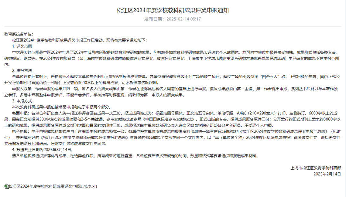 现转发松江区2024年度学校教科研成果评奖申报通知,请以各职能部门、二级学院为单位将纸质版和电子版(包括申报汇总表)提交科研处饶浩老师。