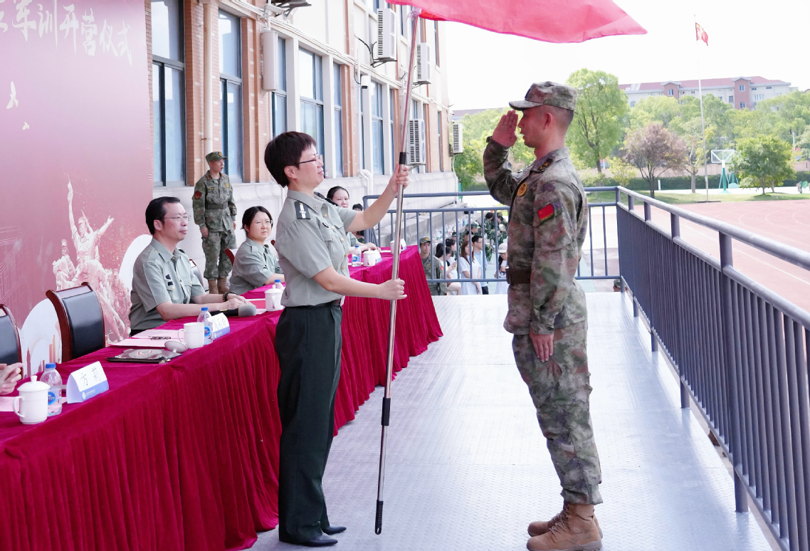 紧接着,进行了激动人心的授旗仪式。周莉娇将象征着荣誉与责任的军训连旗授予各连长手中,寓意着军训任务的正式交接与责任的传递。