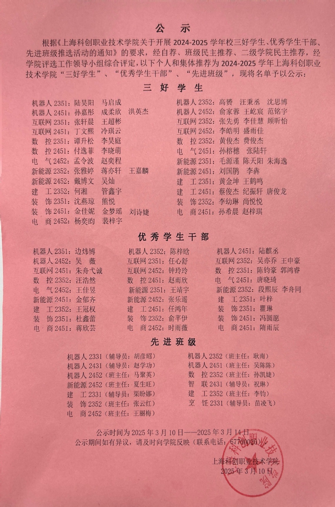 2024-2025学年KY开元集团官网入口“三好学生”、“优秀学生干部”、“先进班级”名单公示