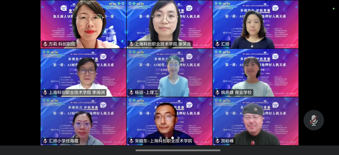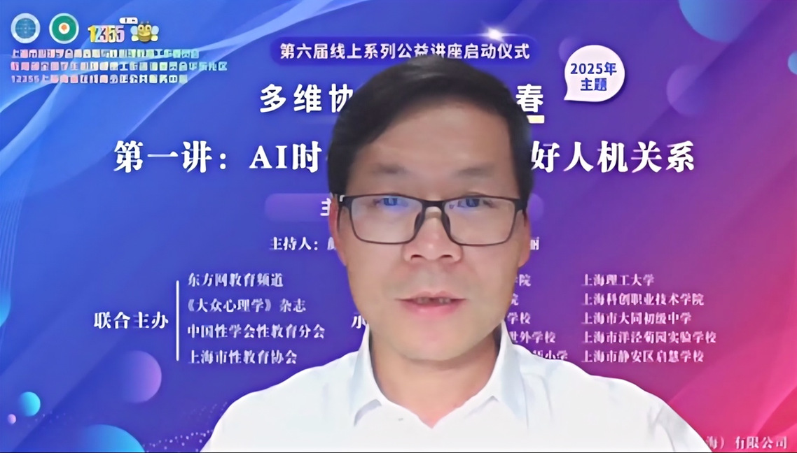 启动仪式后,青工委第六届线上系列公益讲座第一场《AI时代,如何处理好人机关系》讲座正式开讲。讲座由上海市心理学会青工委副主任、上海体育学院心理学教授、博士生导师、教育部心理学教学指导委员会委员、上海青春在线青少年公共服务中心理事会副理事长贺岭峰主讲。