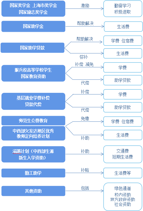 国家和上海在高等教育本专科阶段建立起国家奖学金、上海市奖学金、国家励志奖学金、国家助学金、国家助学贷款等多种形式有机结合的高校学生资助政策体系。