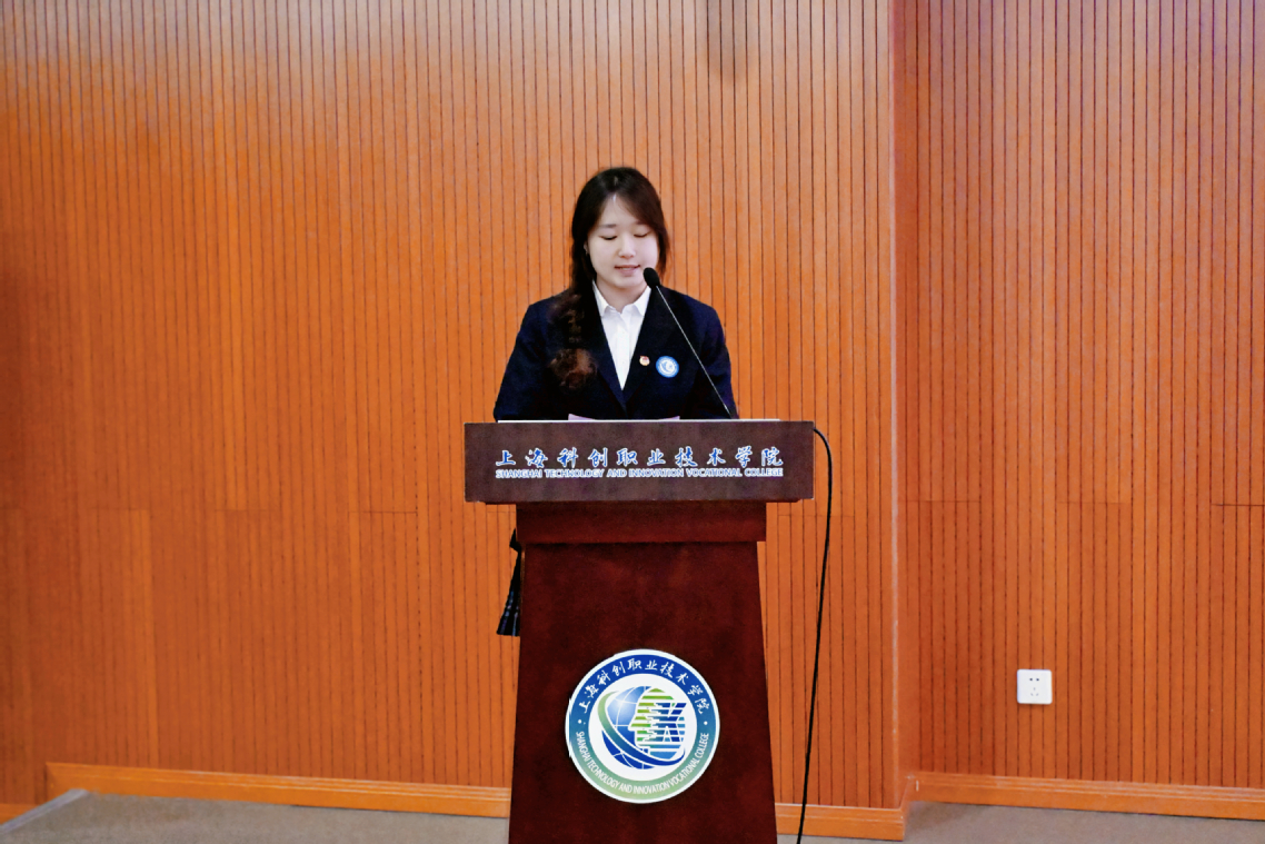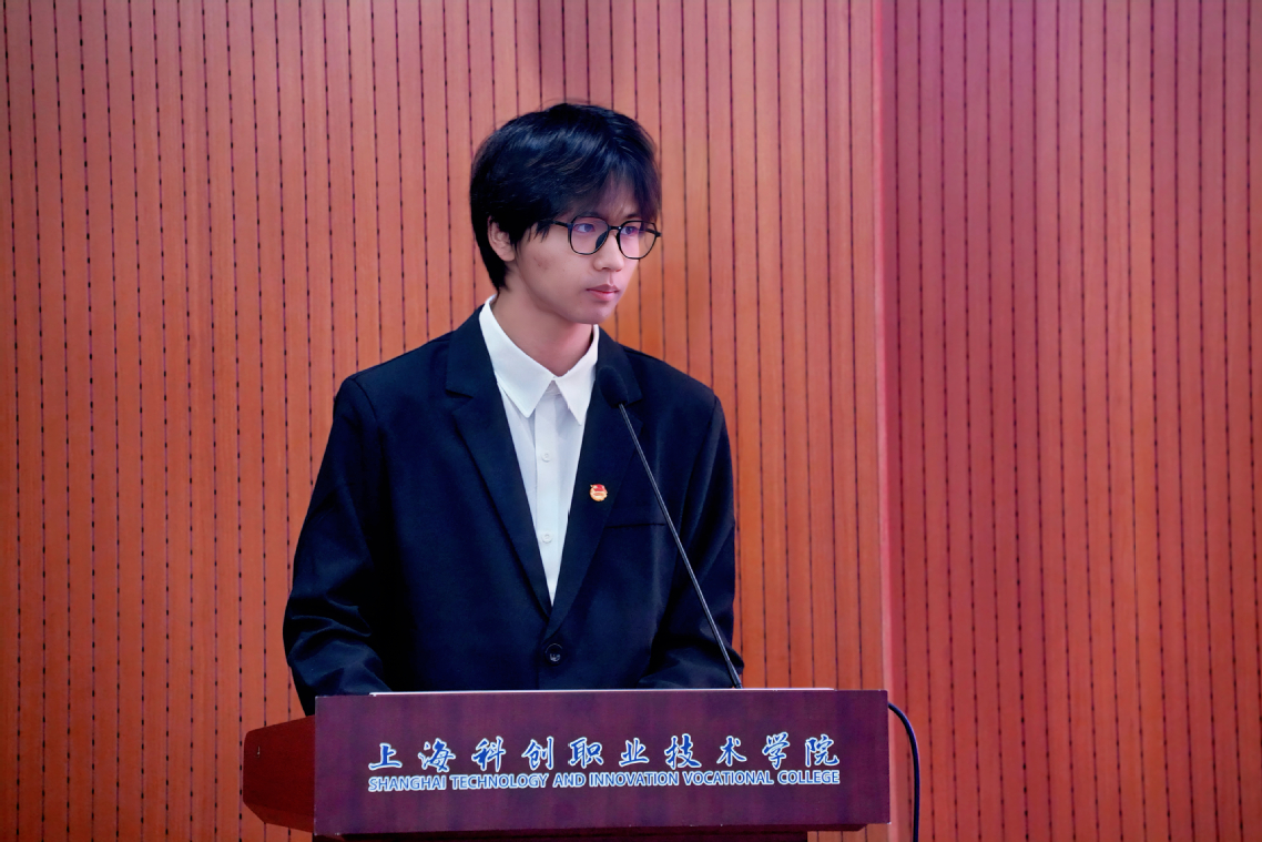 仪式上还宣布了2025学年的新团员名单,各二级学院领导为新发展团员代表颁发团章、团员证并佩戴团徽。在鲜艳的团旗下,全体新团员高举右拳,庄严宣誓。铿锵有力的誓言回荡在会场,展现了新时代团员青年的坚定信念和责任担当。智能汽车学院袁子悦同学作为新团员代表发言,表达了加入团组织的激动心情和坚定跟党走、奋进新时代的庄严承诺。