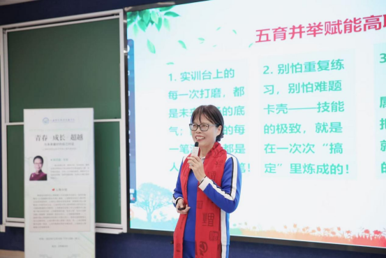 讲座中,颜老师分享了多位上海职教学子的超越故事:上海市建筑工程学校方成、王之冲从无人机社团到“挑战杯”金奖的创业历程;曹杨职业技术学校常晨19岁即获全国职业技能大赛冠军,破格晋升高级技师;上海市经济管理学校刘家好从中职生成长为走向世界名校的技能英才……这些身边榜样的真实经历,深深打动了在场学生,让大家看到“技能成才、人生出彩”的无限可能。