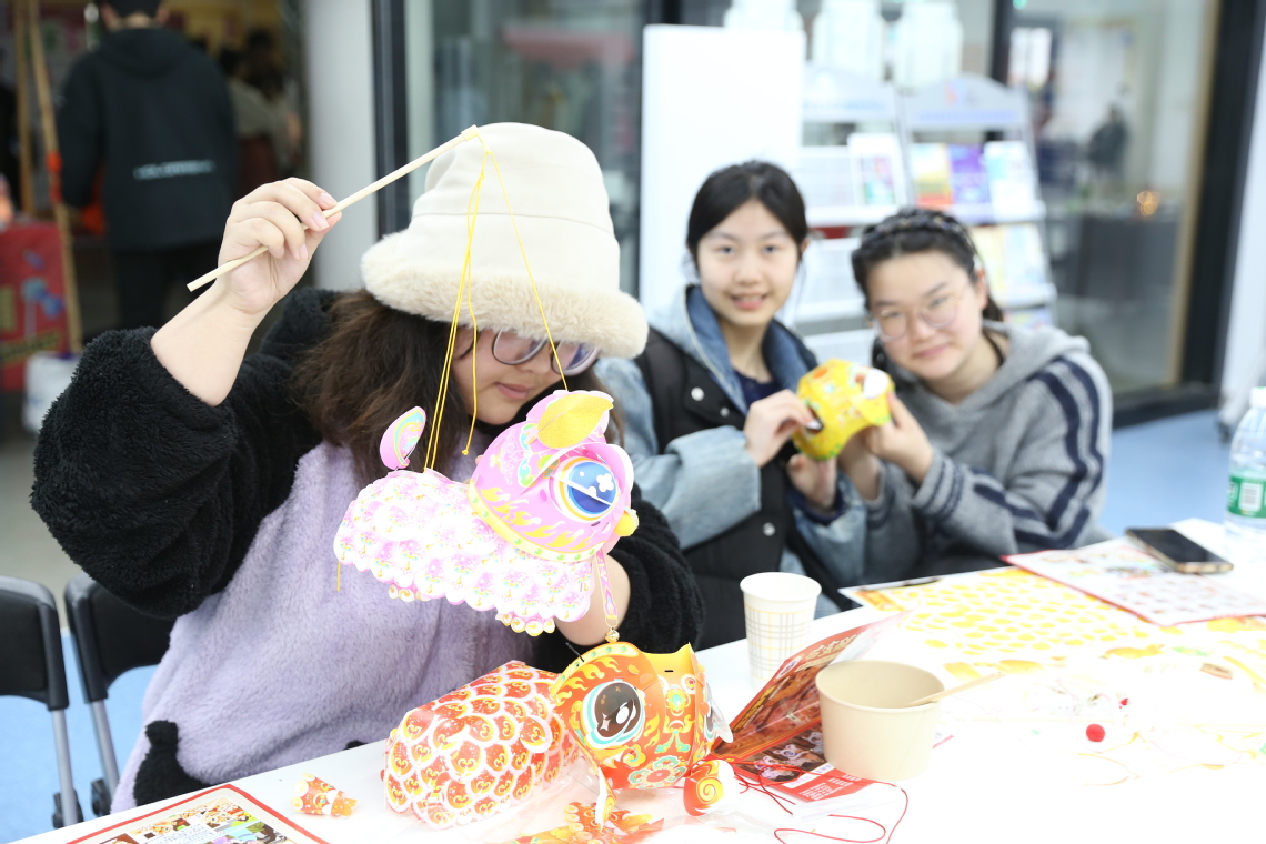 花灯、剪纸、福字挂件齐上阵。你帮我裁纸,我教你折花,一盏盏红灯笼点亮了节日夜晚。