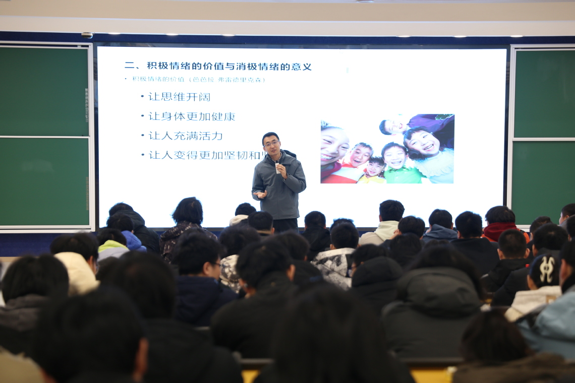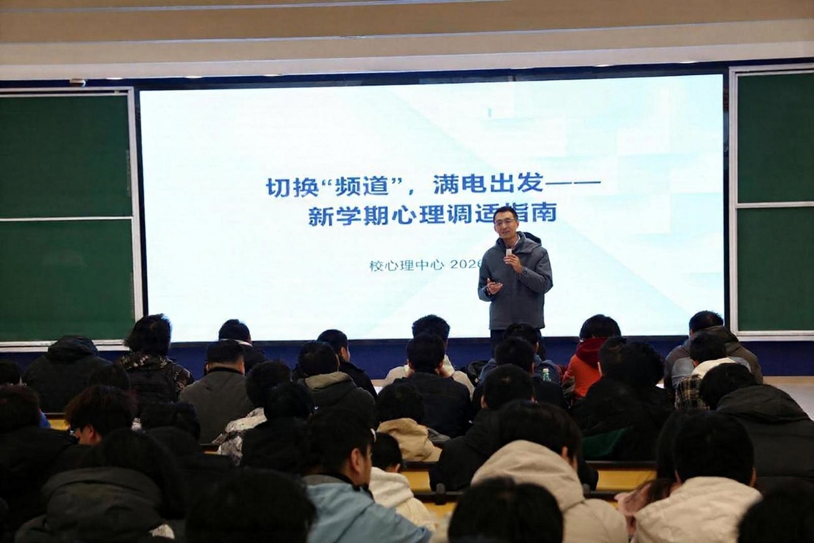 与此同时,在6号楼203阶梯教室,学工部心理中心为三年制学生举办了新学期心理适应性讲座《切换“频道”,满电出发——新学期心理调适指南》,约200名学生参与。学工部负责人张玲老师开场致辞,鼓励同学们重视心理健康,学会主动调适。心理中心宋晓东老师从开学压力切入,结合积极心理学理论,深入剖析情绪规律,引导学生接纳情绪、保持平衡,并分享了记录幸福瞬间、品味当下美好、规律作息、适度运动等增强积极情绪的方法。讲座穿插诗词引用、案例分享与互动提问,现场气氛轻松活跃,帮助学生有效调整心态,提升情绪管理能力。