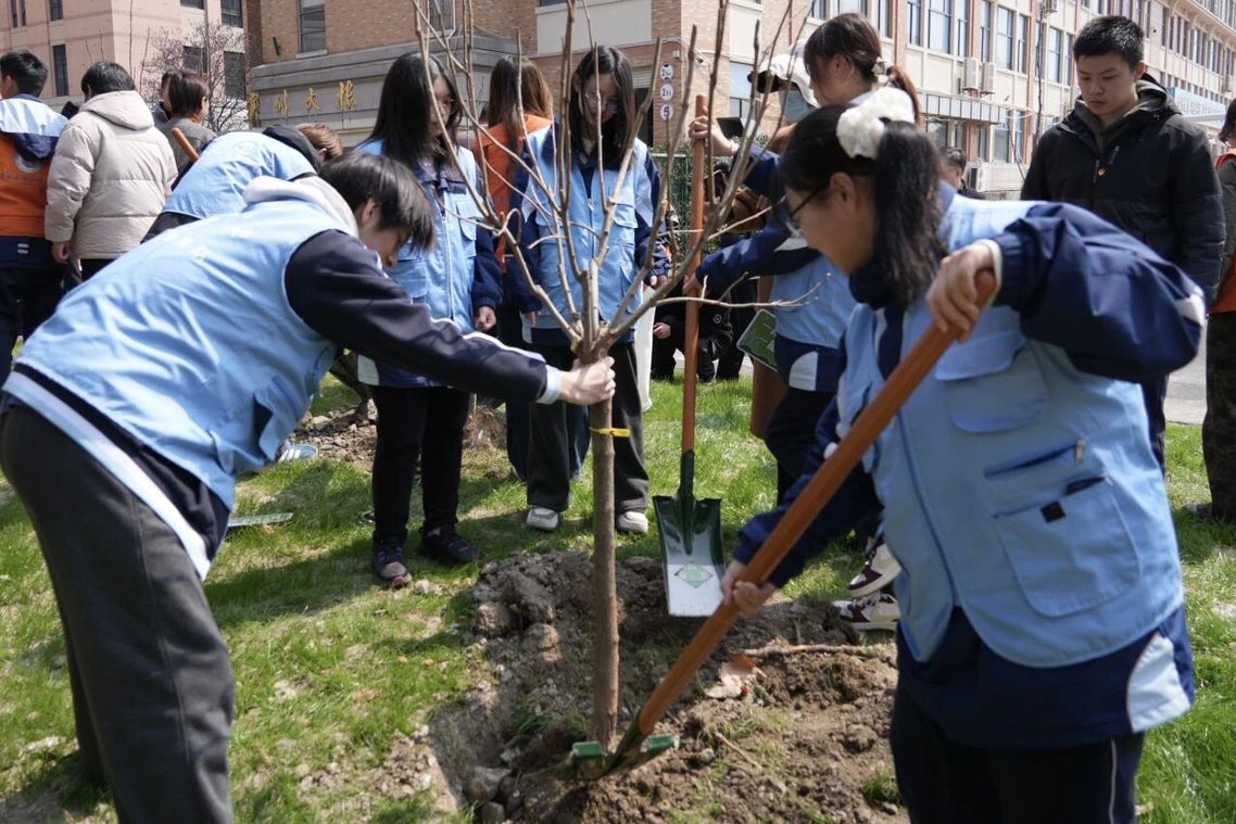 校领导与同学们并肩劳作,挖坑、扶苗、培土、浇水,“劳动光荣、绿色发展”的价值观念在谈笑间自然传递。现场分工明确、配合默契,工作人员穿梭其间巡回指导,确保每一棵树苗都栽得规范、种得安心。短短半小时,几十株树苗便在春风中稳稳立起。
