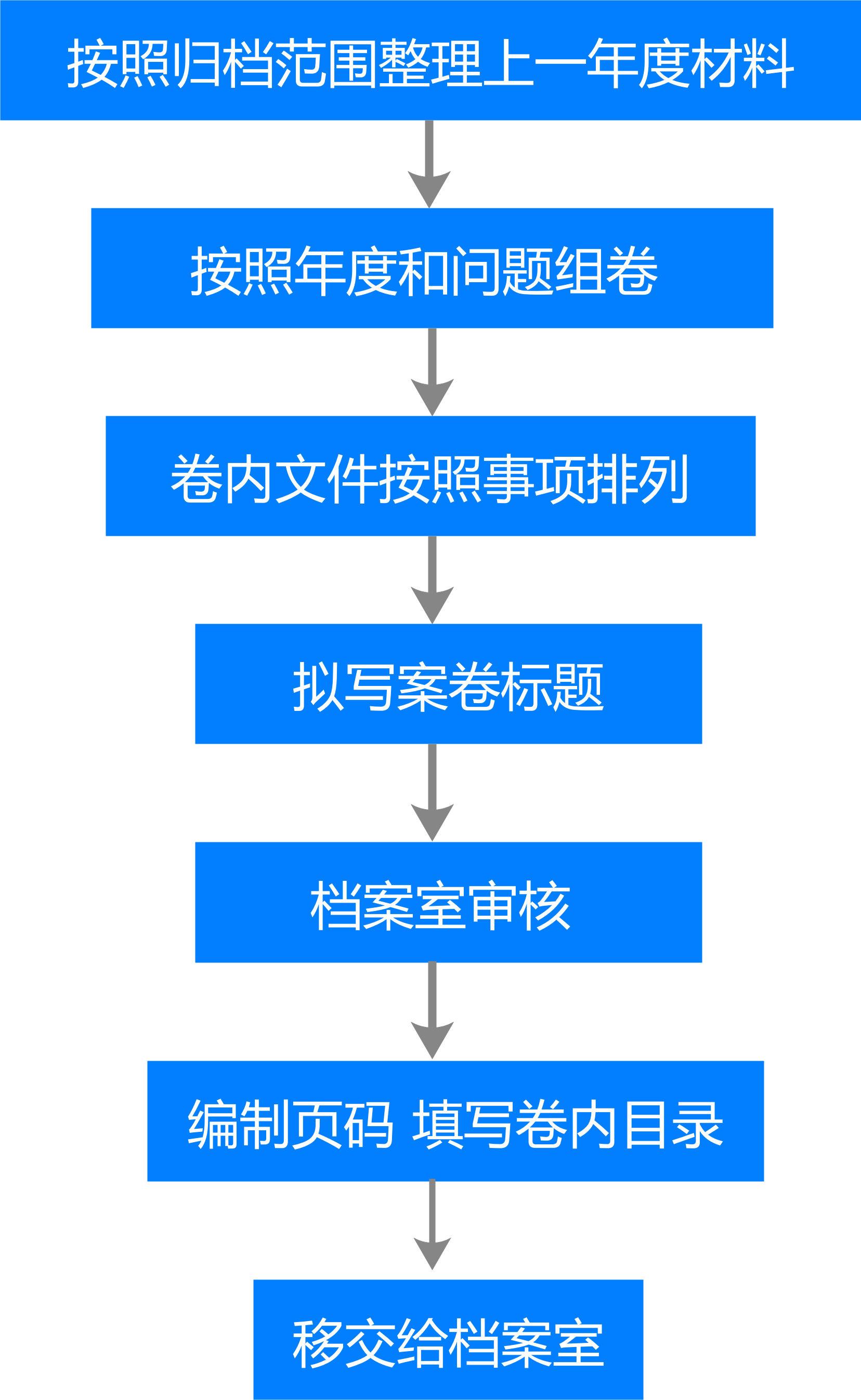 文件归档时间是在文件形成后的第二年上半年,即在次年3月底以前向档案部门移交。以一年为界,每年一次归档,文件年年清理完毕。