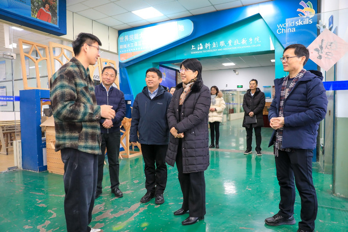 座谈会前,叶文娣一行参观了学校的实训中心,深入了解了学校教育教学工作的开展情况以及邵茹鹏老师的工作环境。