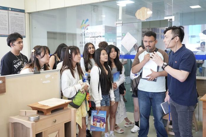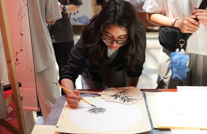 下午,代表团成员和科创学子们共同体验了中国传统文化。他们亲手在纯白的布料上扎染出一抹中国蓝,在洒金红纸上挥毫泼墨写下中国福,共同感受国画、香囊等中华优秀传统文化的独特魅力。