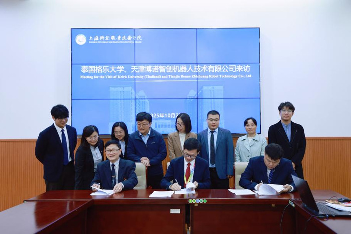 周旺发表示,非常荣幸能为两所高校搭建合作桥梁。此次联合科创职院向泰国格乐大学捐赠的人工智能与工业机器人系统设备,将让泰国师生共享中国智能制造发展的成果,推动中泰技术共同进步。他希望今后三方合作继续走实,在人才培养、技术研发、国际交流等方面持续深化,实现共赢。 在与会嘉宾的共同见证下,三方代表正式签署国际合作共建协议,这标志着两校在国际产教融合方面迈出实质性一步。