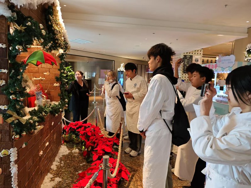 而姜饼小屋组的同学们,则有幸观看到了圣诞姜饼小屋的制作过程。这是一项既考验耐心又需要精细技巧的工作。在糕点师的示范下,同学们了解了姜饼小屋的制作步骤和装饰技巧,并亲手制作了属于自己的小型姜饼小屋。这些小屋不仅造型精美,还充满了节日的氛围。