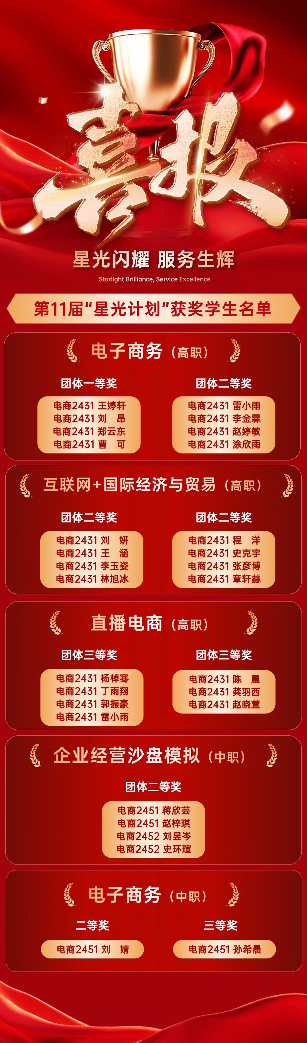 本次大赛中,智慧服务学院精心组织跨境电子商务2431班、2451、2452班34名学生参赛,全力冲击高职组(电子商务、直播电商、互联网+国际经济与贸易)与中职组(电子商务、企业经营沙盘模拟、国际商务实务)六大项目。经过多轮激烈比拼,最终斩获高职组一等奖1项、二等奖3项、三等奖2项,中职组二等奖2项、三等奖1项,29人次获奖,获奖率高达85%。并获电子商务(高职)团体项目第一名,互联网+国际贸易(高职)团体项目第三名,充分展现了智慧学院学子的专业实力。