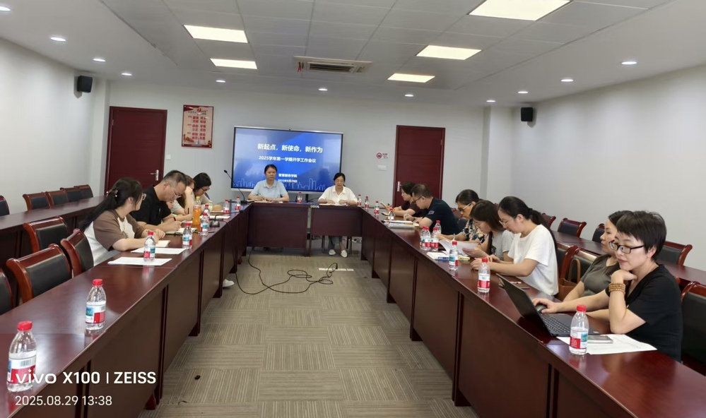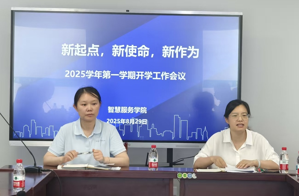 2025年8月29日下午,智慧服务学院召开2025学年第一学期开学工作会议。会议由副院长潘丽花、夏蕾共同主持,全体教师齐聚一堂,以“新起点,新使命,新作为”为命题,共话智慧学院发展蓝图。
