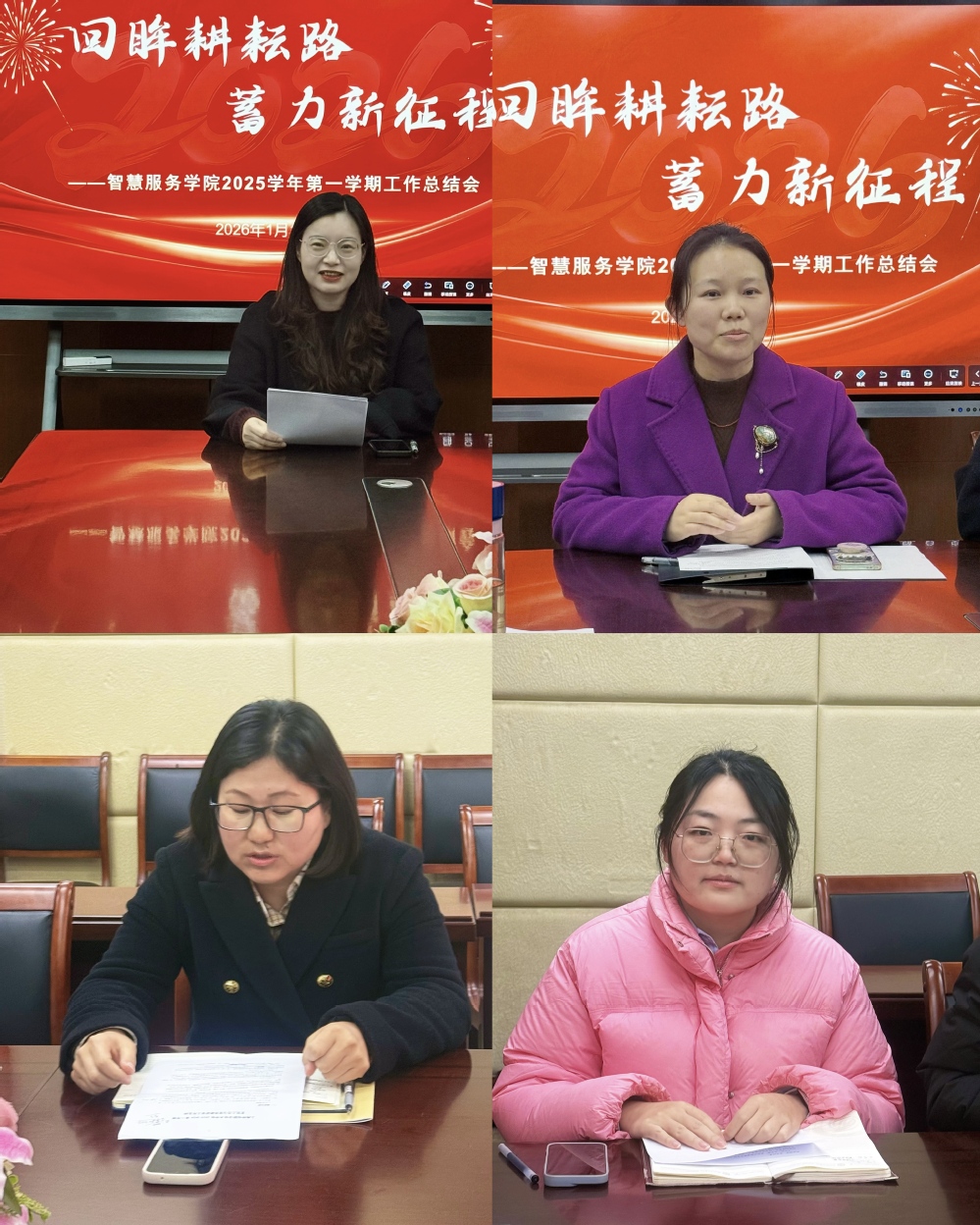 为全面复盘本学期智慧服务学院各项工作成效,系统梳理发展中的问题与不足,科学谋划下学期工作蓝图,1月19日下午,智慧服务学院以“回眸耕耘路,蓄力新征程”为主题,在11号楼底楼会议室召开了2025学年第一学期总结会。智慧服务学院全体教职工参加了总结会。会议由潘丽花副院长主持。