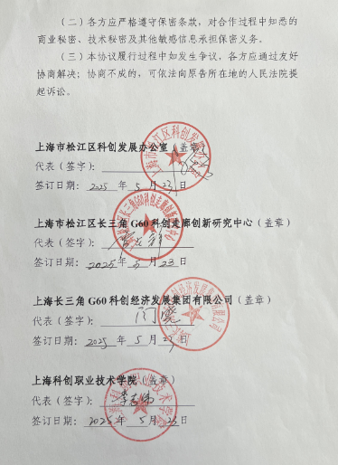 为深入贯彻党的二十届三中全会关于“深化产教融合、校企合作”的重要精神,落实《国家职业教育改革实施方案》及上海市职业教育产教融合相关政策,充分发挥松江区作为长三角G60科创走廊核心区域的产业与教育资源优势,构建“政府引导、研究驱动、企业主体、学校育人”的产教融合协同创新机制,上海市松江区科创发展办公室(以下简称“区科创办”)、上海市松江区长三角G60科创走廊创新研究中心(以下简称“区G60创新研究中心”)、上海长三角G60科创经济发展集团有限公司(以下简称“G60科创集团”)、KY开元集团官网入口(以下简称“科创学院”)经友好协商,就共建松江“科创联盟”达成如下战略合作框架协议,以构建四方联动,打造“政研企校”四位一体的产教融合创新生态体系。协议签订时间:2025年5月23日