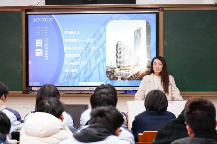 刁海花女士自2009年7月加入上海江河幕墙系统工程有限公司以来,一直致力于幕墙工程的质量与安全监管工作。凭借出色的专业能力和高度的责任心,她屡获公司嘉奖,包括“优秀干部奖”与“企业忠诚奖”,并已取得检测专业中级职称,成为公司质量管理的中坚力量。此次讲座,她以丰富的实践经验和深厚的行业洞察,为学生们带来了一场内容翔实、深入浅出的精彩分享。