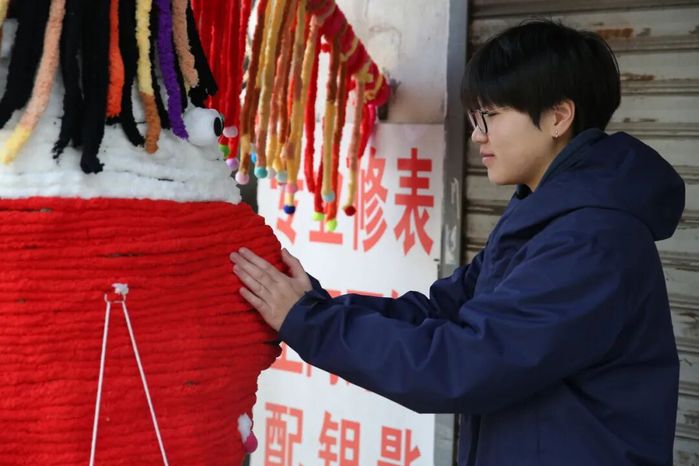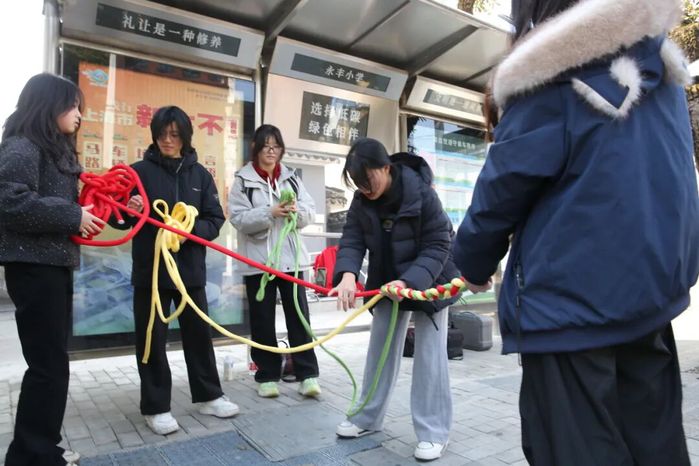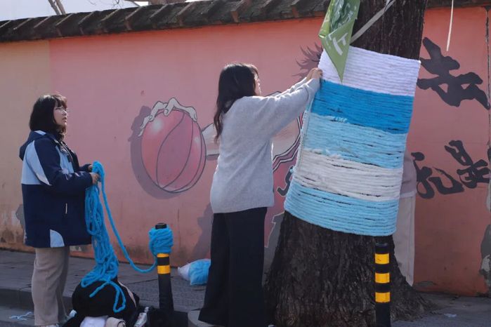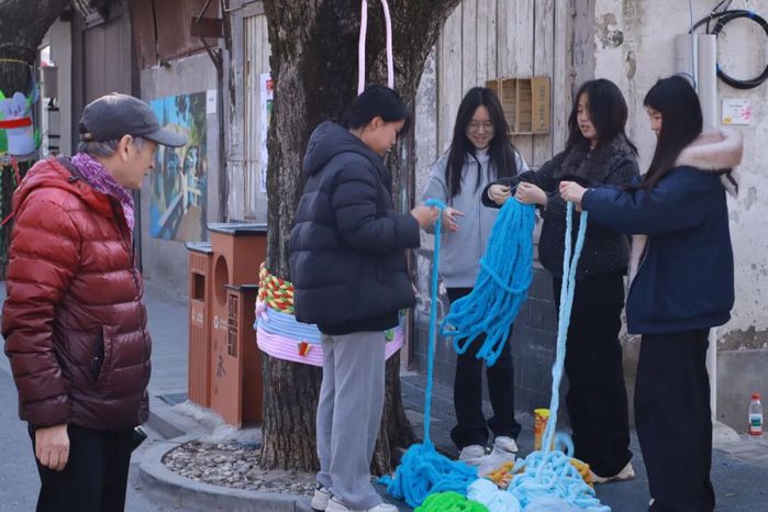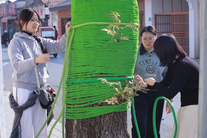 活动现场,同学们迅速分工,用五彩斑斓的毛线和充满童趣的装饰,为街边的老树穿上了厚厚的“新衣”,让这条江南古街在寒冬中焕发出别样的温暖与生机。指导老师们一边传授技巧,一边讲解古建筑与树木共生的生态意义。经过一番忙碌,一件件色彩明快、样式规整的树木防寒“冬衣”陆续完工,成为古街冬日里的特色景观,吸引不少市民驻足观赏、拍照记录。