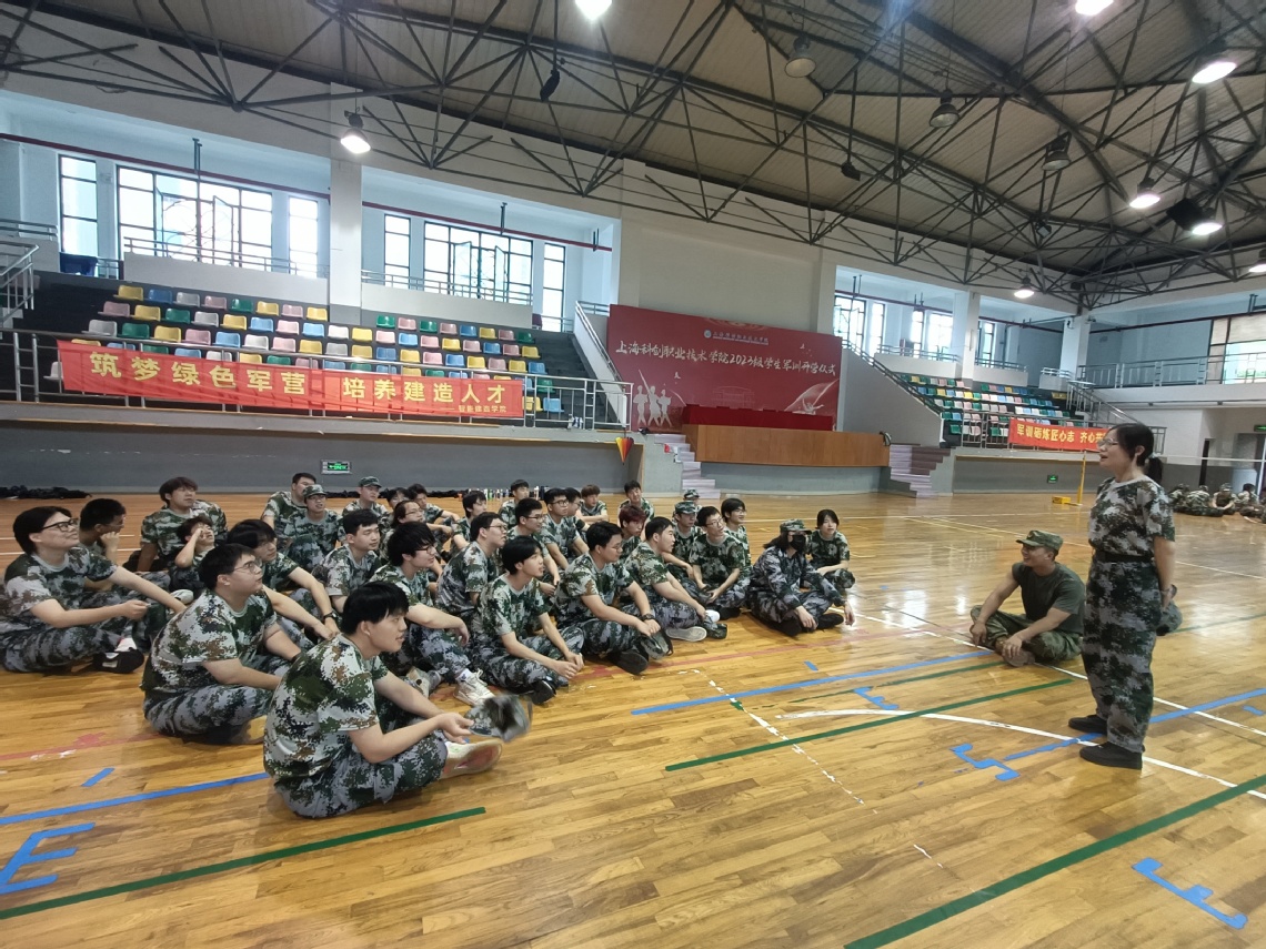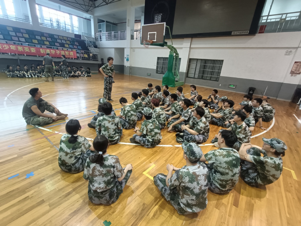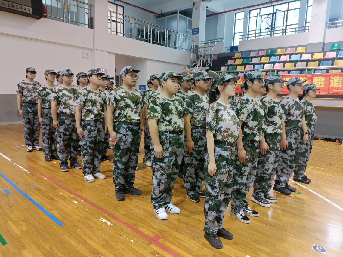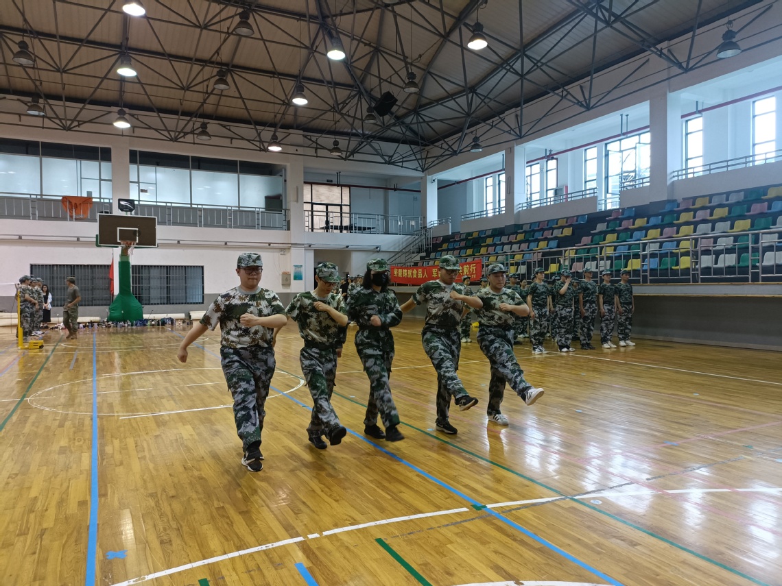 光,细细密密地抖落在同学们的肩头、膝上,在场地上投下一个个微晃却又笔直的阴影;汗一颗颗顺着脖子、胳膊,伴随着时光,一同从指缝滑落。所有同学都感到了前所未有的劳累,但是每个同学内心那颗坚持的灵魂却一直在。今天训练的内容主要是行进间踏步走、正步走分解动作之—腿部踢腿训练和手部摆臂训练。在教官的严格指导下,同学们不畏艰难,刻苦训练,每一次动作都力求标准,每一次演练都全力以赴。他们的脸上洋溢着青春的光彩,汗水浸湿了衣背,却从未有过半分退缩。整个七连,训练顺利且整齐,教官对同学们的训练非常满意,对同学们连连夸赞!休息期间,教官以“唱歌”的方式活跃氛围,唱的正是昨晚组织大家学习的《当那一天真的来临》,姚毅同学领唱开头,兴许是大家受到了教官的夸赞,同学们唱的也是干劲十足,好似要掀翻整个体育馆。