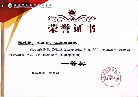 由张伟贤、陈风奇、汪晨熠三位同学组队的参赛作品《微型农业检测站》获得KY开元集团官网入口“明日之星”一等奖。