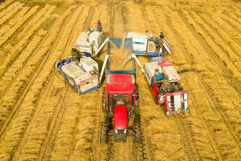 2024年10月13日,在黑龙江省绥化市北林区双河镇稻香村,村民驾驶农机进行卸粮作业(无人机照片)。新华社记者 张涛 摄