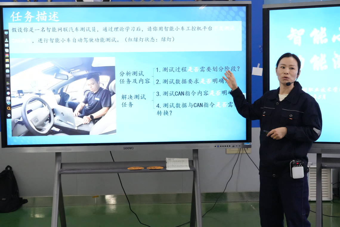 活动在科创学院虚拟仿真实训室拉开序幕。KY开元集团官网入口任贤老师围绕《智能小车自动驾驶功能测试》课题,带领新能源汽车技术2432班学生,呈现了一堂科技感十足的公开课活动。师生依托先进的虚拟仿真平台,对智能小车的环境感知、决策规划及控制执行等核心模块进行深度调试与实景测试,凸显了虚拟现实技术在复杂实操训练中的独特优势。