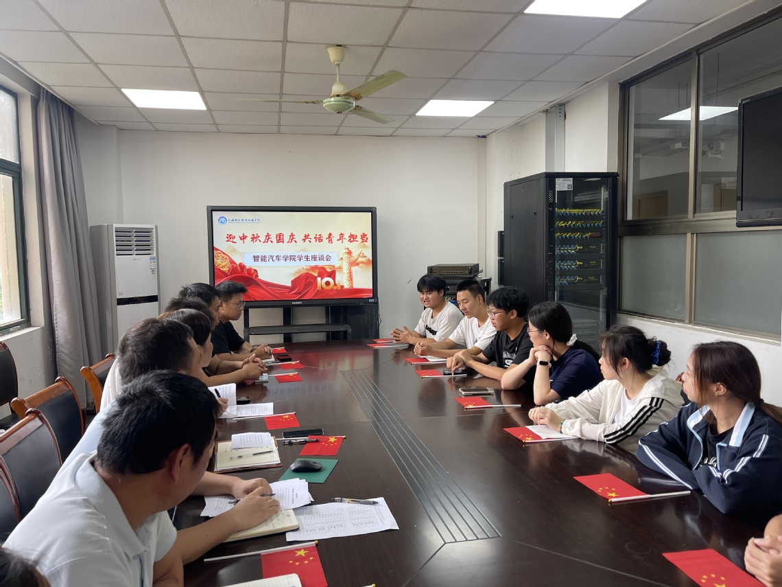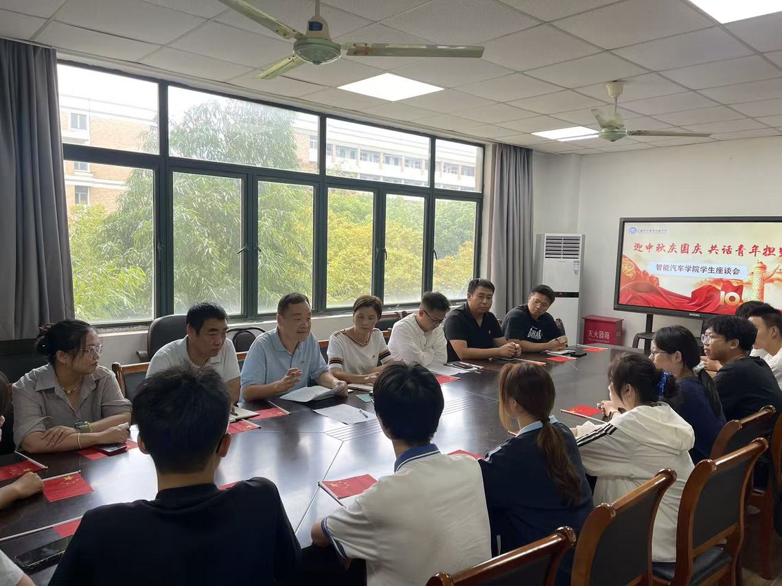 秋高气爽,丹桂飘香。为热烈庆祝中华人民共和国成立76周年,喜迎中华民族传统中秋佳节,大力弘扬以爱国主义为核心的民族精神,深入引导青年学生将个人理想融入国家发展伟业,深刻认识新时代赋予的历史使命与责任担当,同时增进师生、生生之间的思想交流与情感融合,按照学校统一部署,智能汽车学院于10月29日组织召开了“迎中秋庆国庆 共话青年担当”学生代表座谈会。本次活动由学院学工负责人朱锋老师主持。