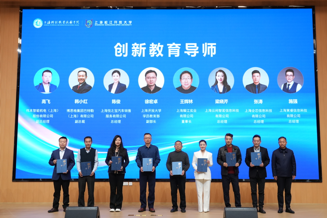借此时机,学院为上海悦之宝汽车销售服务有限公司总经理陈俊、博思格集团巴特勒(上海)有限公司副总裁韩小红、伟本智能机电(上海)股份有限公司副总经理高飞等8位行业领军人物颁发创新教育导师聘任证书。未来,这些产业“大咖”将深度介入创新人才培养全过程,为学生提供更广阔的行业视野和优质资源。