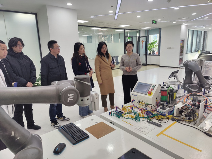 在达明机器人公司,活动首站参观了企业的产品展厅,实地观摩了其先进的机器人产品线与智能化解决方案,直观感受了智能制造的前沿应用场景。随后,双方在会议室进行了深入座谈。企业负责人详细介绍了公司的发展历程、技术优势与未来规划,学院教师代表与企业经理就人才培养、课程建设、实习就业等方面展开了务实交流。